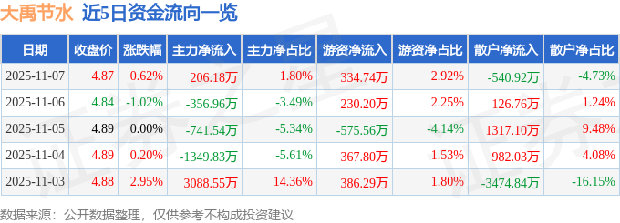 证券之星消息,截至2025年11月7日收盘,大禹节水(300021)报收于4.87元,上涨0.62%,换手率2.68%,成交量23.36万手,成交额1.14亿元。