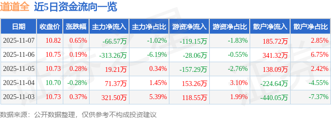 11月7日的资金流向数据方面,主力资金净流出66.57万元,占总成交额1.02%,游资资金净流出119.15万元,占总成交额1.83%,散户资金净流入185.72万元,占总成交额2.85%。