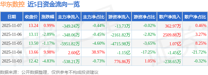证券之星消息,截至2025年11月7日收盘,华东数控(002248)报收于13.24元,上涨0.99%,换手率19.35%,成交量59.51万手,成交额7.97亿元。