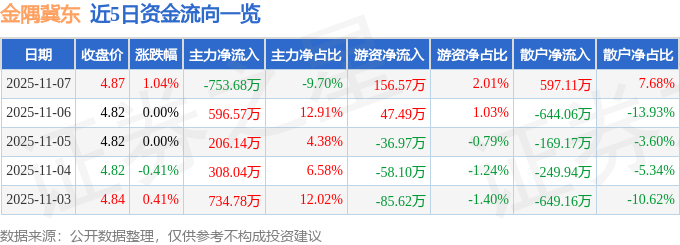 证券之星消息,截至2025年11月7日收盘,金隅冀东(000401)报收于4.87元,上涨1.04%,换手率0.61%,成交量15.97万手,成交额7770.6万元。