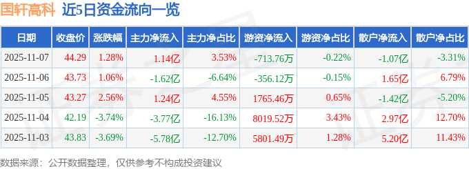11月7日的资金流向数据方面,主力资金净流入1.14亿元,占总成交额3.53%,游资资金净流出713.76万元,占总成交额0.22%,散户资金净流出1.07亿元,占总成交额3.31%。