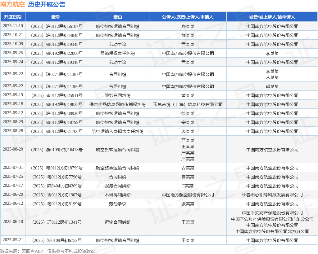 案号:(2025)沪0112民初56107号根据统计,近一年内以中国南方航空股份有限公司为当事人的历史开庭公告有54则,其中案由为“航空旅客运输合同纠纷”的公告以18则居首,其次为“合同纠纷”有8则,“劳动争议”有6则。历史开庭公告(前20条)如下: