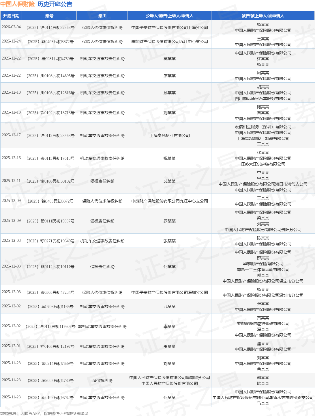 案号:(2025)沪0120民初23305号根据统计,近一年内以中国人民财产保险股份有限公司为当事人的历史开庭公告有2032则,其中案由为“机动车交通事故责任纠纷”的公告以1394则居首,其次为“保险人代位求偿权纠纷”有160则,“交通事故”有71则。历史开庭公告(前20条)如下: