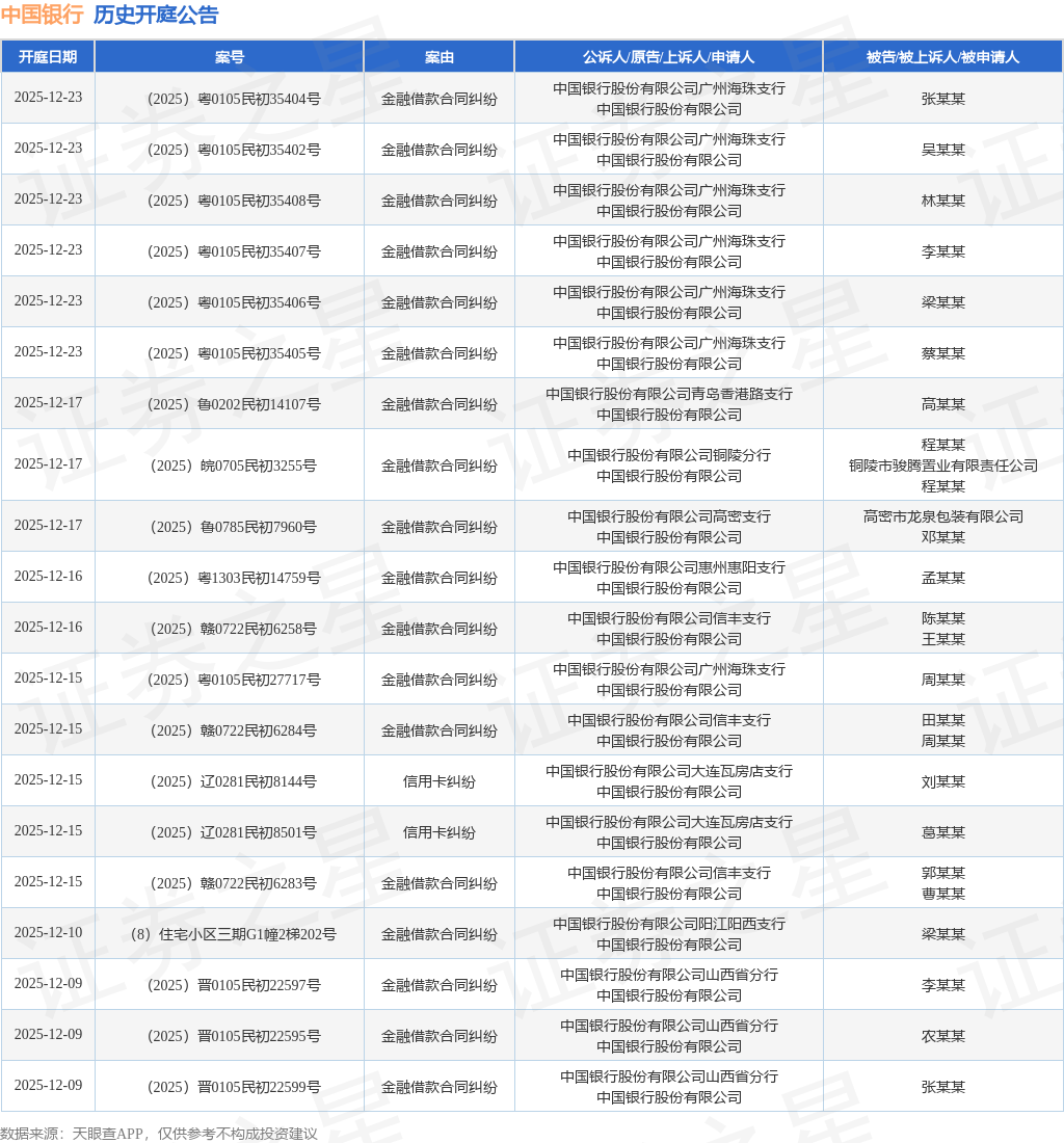 案号:(2025)云0114民初11622号根据统计,近一年内以中国银行股份有限公司为当事人的历史开庭公告有148则,其中案由为“金融借款合同纠纷”的公告以119则居首,其次为“信用卡纠纷”有15则,“借款合同纠纷”有4则。历史开庭公告(前20条)如下: