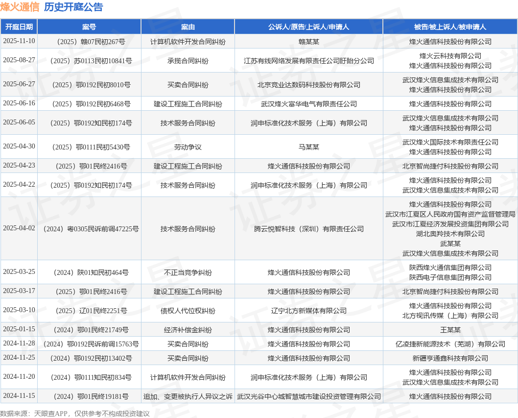 案号:(2025)赣07民初267号根据统计,近一年内以烽火通信科技股份有限公司为当事人的历史开庭公告有17则,其中案由为“买卖合同纠纷”的公告以3则居首,其次为“建设工程施工合同纠纷”有3则,“技术服务合同纠纷”有3则。历史开庭公告如下: