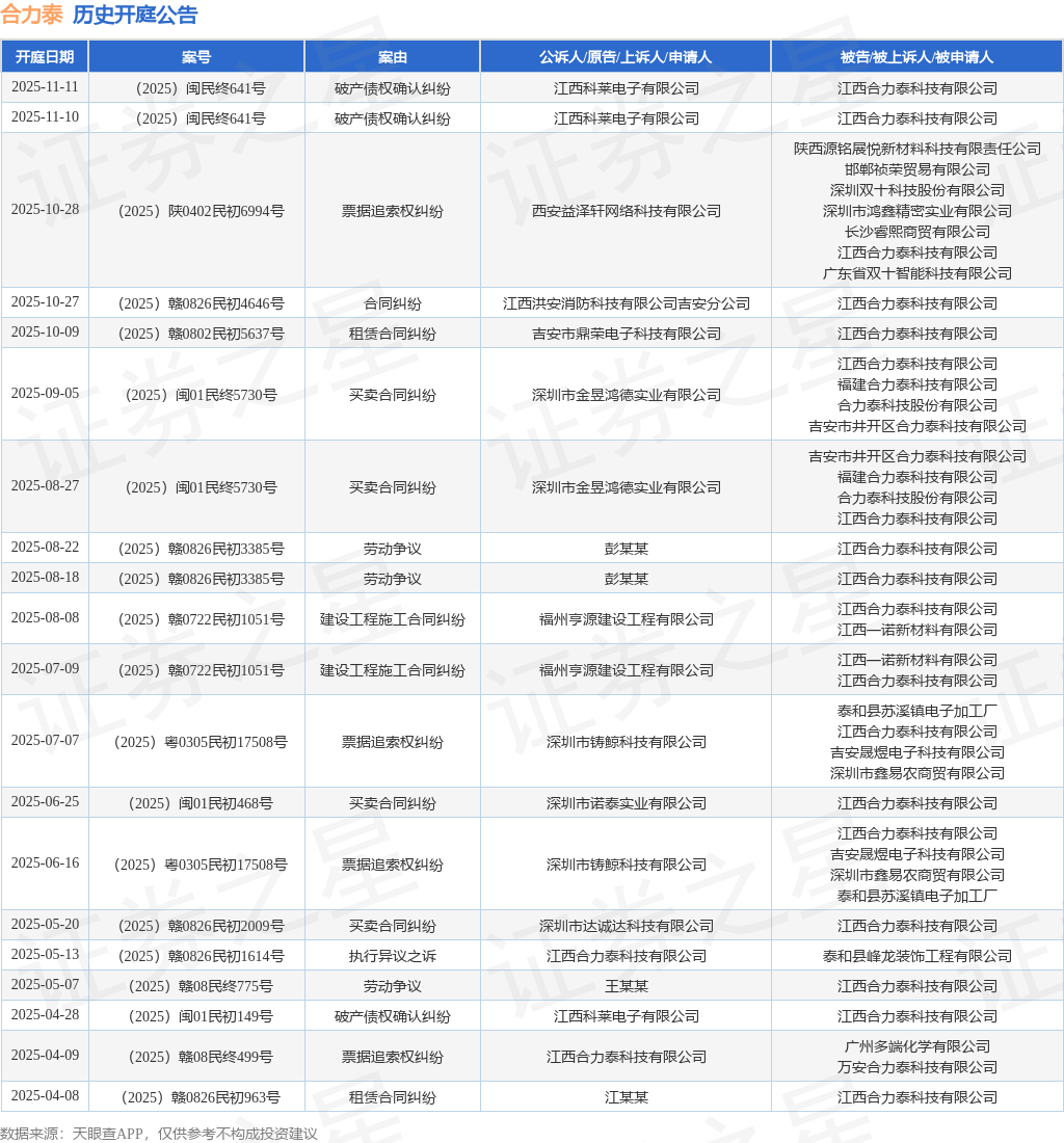 案号:(2025)闽民终641号根据统计,近一年内以江西合力泰科技有限公司为当事人的历史开庭公告有64则,其中案由为“票据追索权纠纷”的公告以25则居首,其次为“建设工程施工合同纠纷”有13则,“买卖合同纠纷”有6则。历史开庭公告(前20条)如下: