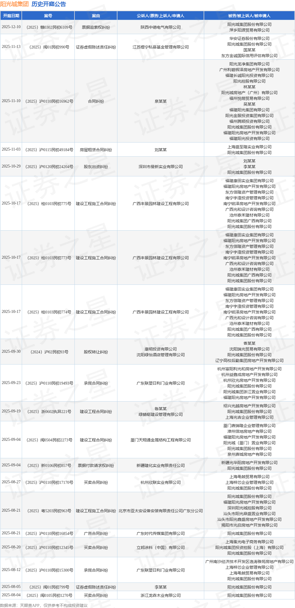 案号:(2025)沪0110民初16962号根据统计,近一年内以阳光城集团股份有限公司为当事人的历史开庭公告有113则,其中案由为“买卖合同纠纷”的公告以33则居首,其次为“票据追索权纠纷”有24则,“合同纠纷”有8则。历史开庭公告(前20条)如下: