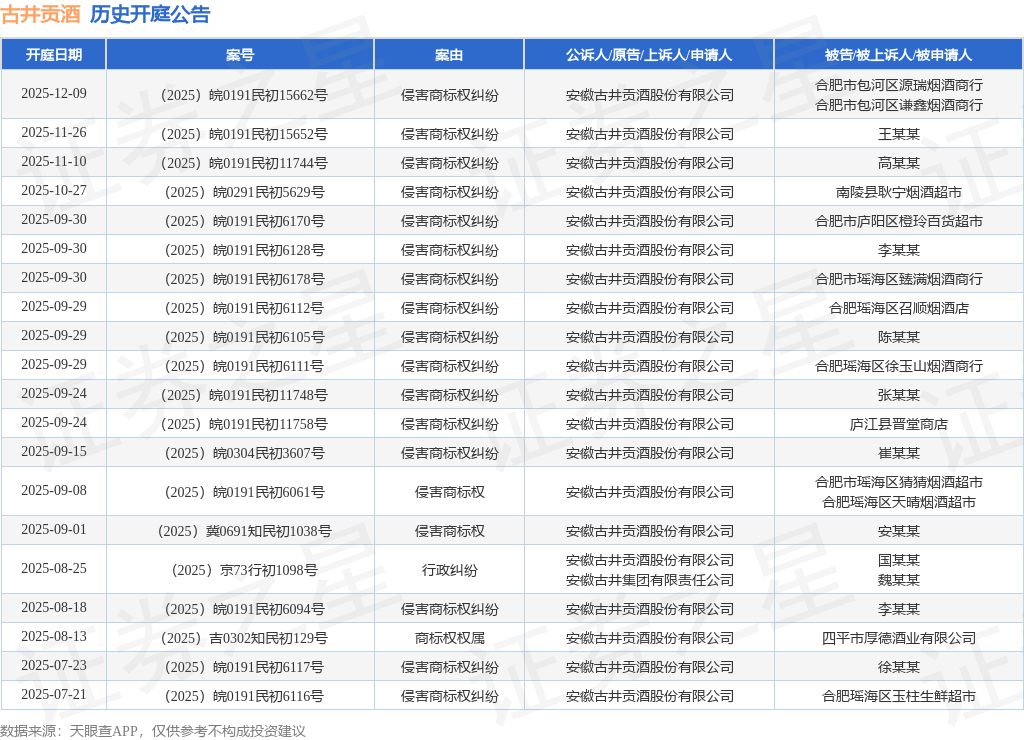 案号:(2025)皖0191民初11744号根据统计,近一年内以安徽古井贡酒股份有限公司为当事人的历史开庭公告有78则,其中案由为“侵害商标权纠纷”的公告以57则居首,其次为“不正当竞争纠纷”有7则,“行政纠纷”有7则。历史开庭公告(前20条)如下: