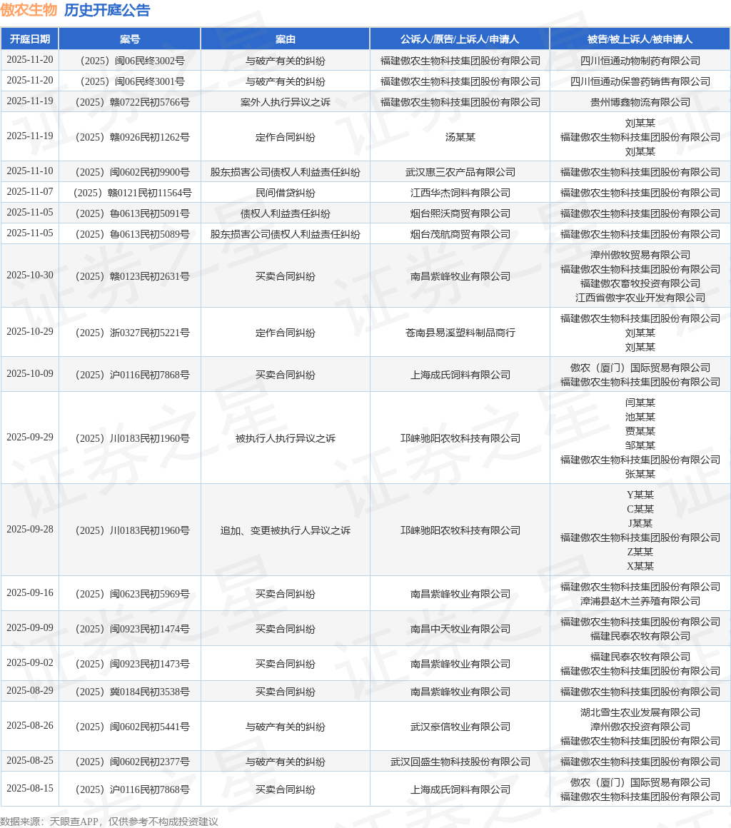 案号:(2025)闽0602民初9900号根据统计,近一年内以福建傲农生物科技集团股份有限公司为当事人的历史开庭公告有101则,其中案由为“买卖合同纠纷”的公告以36则居首,其次为“金融借款合同纠纷”有21则,“与破产有关的纠纷”有16则。历史开庭公告(前20条)如下: