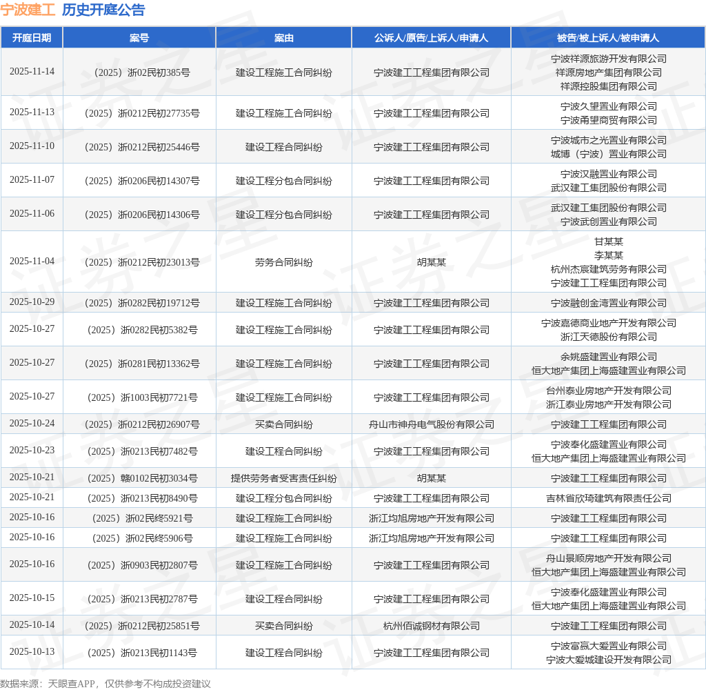 案号:(2025)浙0212民初25446号根据统计,近一年内以宁波建工工程集团有限公司为当事人的历史开庭公告有125则,其中案由为“建设工程施工合同纠纷”的公告以31则居首,其次为“买卖合同纠纷”有29则,“建设工程合同纠纷”有20则。历史开庭公告(前20条)如下:
