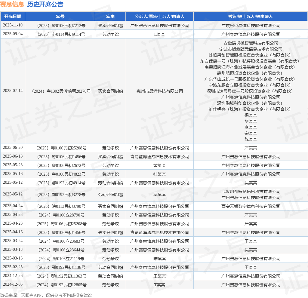 案号:(2025)粤0106民初7212号根据统计,近一年内以广州赛意信息科技股份有限公司为当事人的历史开庭公告有19则,其中案由为“劳动争议”的公告以10则居首,其次为“买卖合同纠纷”有5则,“劳动合同纠纷”有4则。历史开庭公告如下: