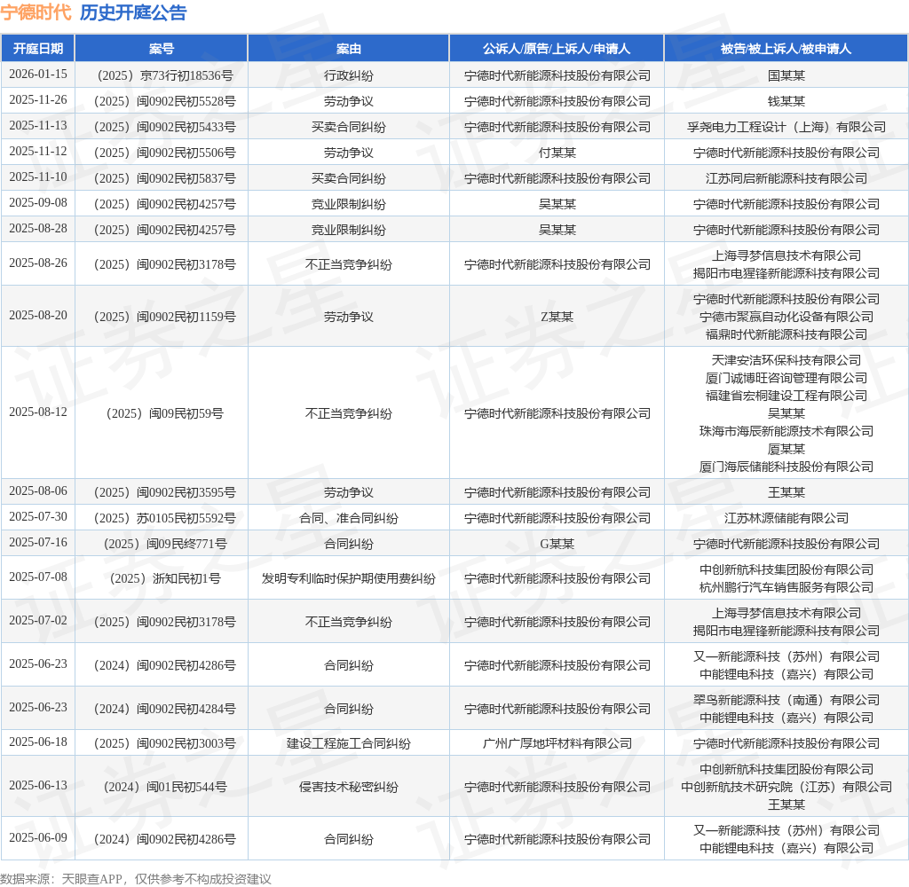 案号:(2025)闽0902民初5837号根据统计,近一年内以宁德时代新能源科技股份有限公司为当事人的历史开庭公告有44则,其中案由为“合同纠纷”的公告以11则居首,其次为“劳动争议”有9则,“侵害技术秘密纠纷”有5则。历史开庭公告(前20条)如下: