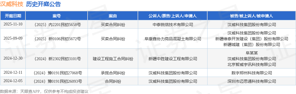 案号:(2025)内2201民初5658号根据统计,近一年内以汉威科技集团股份有限公司为当事人的历史开庭公告有5则,其中案由为“买卖合同纠纷”的公告以2则居首,其次为“合同纠纷”有1则,“建设工程施工合同纠纷”有1则。历史开庭公告如下: