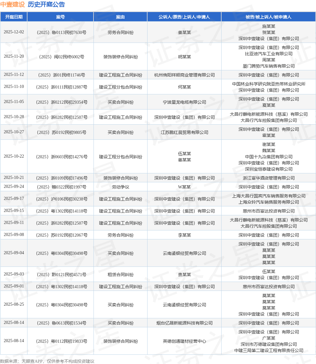 案号:(2025)浙0111民初12887号根据统计,近一年内以深圳中壹建设(集团)有限公司为当事人的历史开庭公告有80则,其中案由为“劳务合同纠纷”的公告以28则居首,其次为“买卖合同纠纷”有12则,“建设工程施工合同纠纷”有10则。历史开庭公告(前20条)如下: