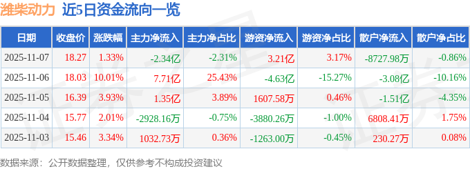证券之星消息,截至2025年11月7日收盘,潍柴动力(000338)报收于18.27元,上涨1.33%,换手率11.27%,成交量562.0万手,成交额101.08亿元。