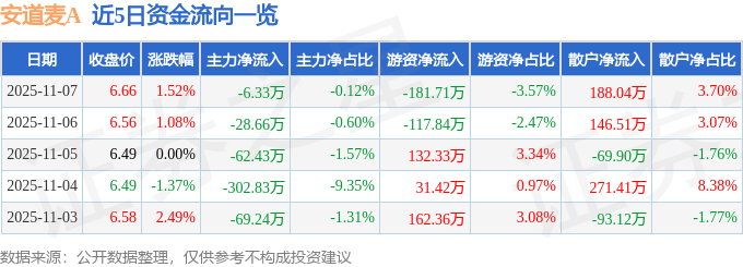 11月7日的资金流向数据方面,主力资金净流出6.33万元,占总成交额0.12%,游资资金净流出181.71万元,占总成交额3.57%,散户资金净流入188.04万元,占总成交额3.7%。