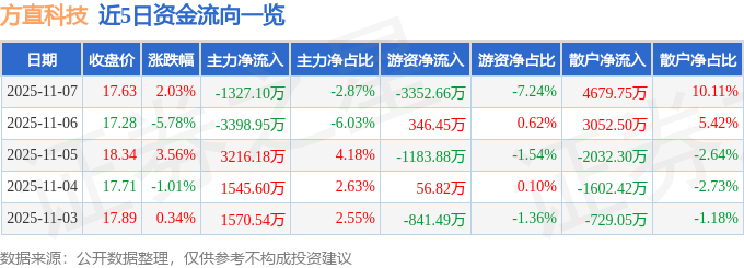 证券之星消息,截至2025年11月7日收盘,方直科技(300235)报收于17.63元,上涨2.03%,换手率12.93%,成交量26.27万手,成交额4.63亿元。