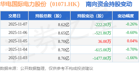 证券之星消息,11月7日南向资金减持222.2万股华电国际电力股份(01071.HK)。近5个交易日中,获南向资金减持的有4天,累计净减持2800.0万股。近20个交易日中,获南向资金减持的有15天,累计净减持8220.6万股。截至目前,南向资金持有华电国际电力股份(01071.HK)8.62亿股,占公司已发行普通股的50.21%。