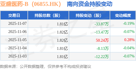 证券之星消息,11月7日南向资金减持33.87万股亚盛医药-B(06855.HK)。近5个交易日中,获南向资金减持的有4天,累计净减持17.45万股。近20个交易日中,获南向资金减持的有14天,累计净减持293.48万股。截至目前,南向资金持有亚盛医药-B(06855.HK)1.81亿股,占公司已发行普通股的48.52%。