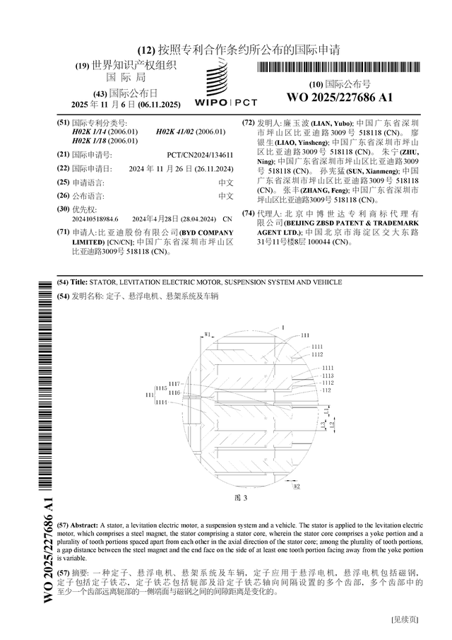 证券之星消息,根据企查查数据显示比亚迪(002594)公布了一项国际专利申请,专利名为“定子、悬浮电机、悬架系统及车辆”,专利申请号为PCT/CN2024/134611,国际公布日为2025年11月6日。