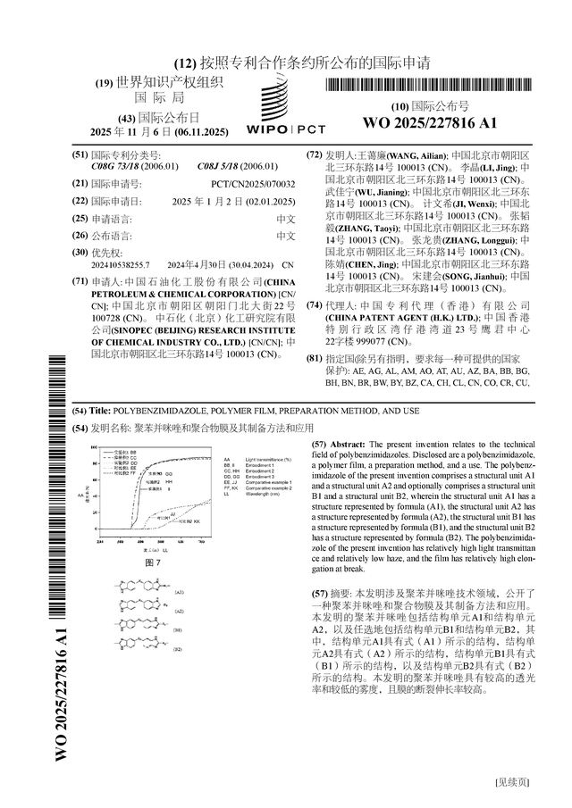 证券之星消息,根据企查查数据显示中国石化(600028)公布了一项国际专利申请,专利名为“聚苯并咪唑和聚合物膜及其制备方法和应用”,专利申请号为PCT/CN2025/070032,国际公布日为2025年11月6日。