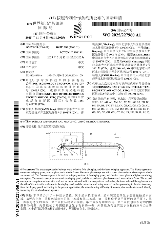 证券之星消息,根据企查查数据显示京东方A(000725)公布了一项国际专利申请,专利名为“显示装置及其制作方法”,专利申请号为PCT/CN2025/082301,国际公布日为2025年11月6日。