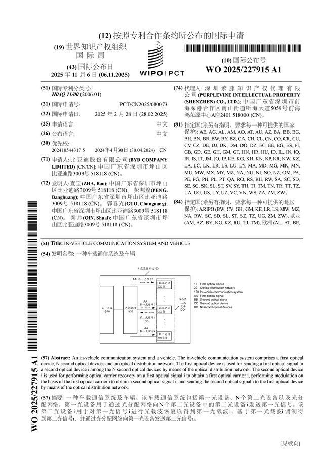 证券之星消息,根据企查查数据显示比亚迪(002594)公布了一项国际专利申请,专利名为“一种车载通信系统及车辆”,专利申请号为PCT/CN2025/080073,国际公布日为2025年11月6日。