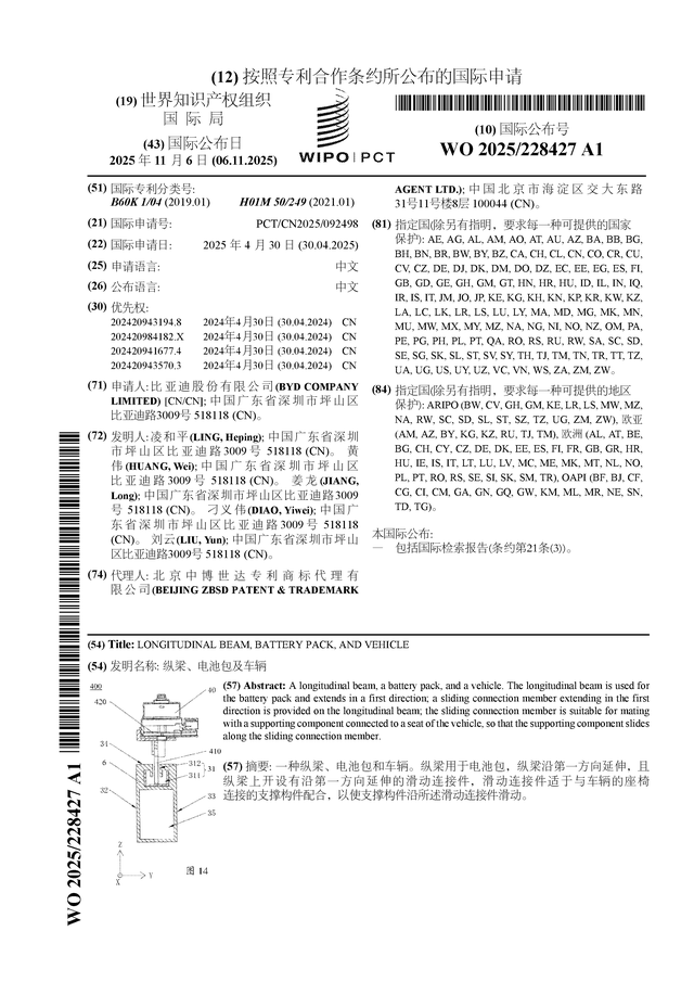 证券之星消息,根据企查查数据显示比亚迪(002594)公布了一项国际专利申请,专利名为“纵梁、电池包及车辆”,专利申请号为PCT/CN2025/092498,国际公布日为2025年11月6日。