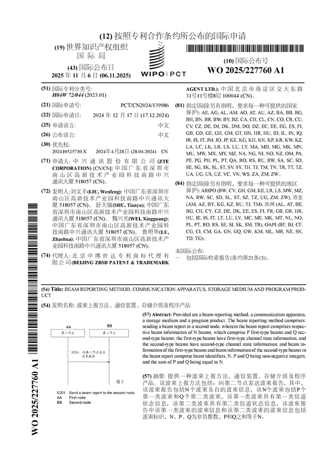 证券之星消息,根据企查查数据显示中兴通讯(000063)公布了一项国际专利申请,专利名为“波束上报方法、通信装置、存储介质及程序产品”,专利申请号为PCT/CN2024/139986,国际公布日为2025年11月6日。