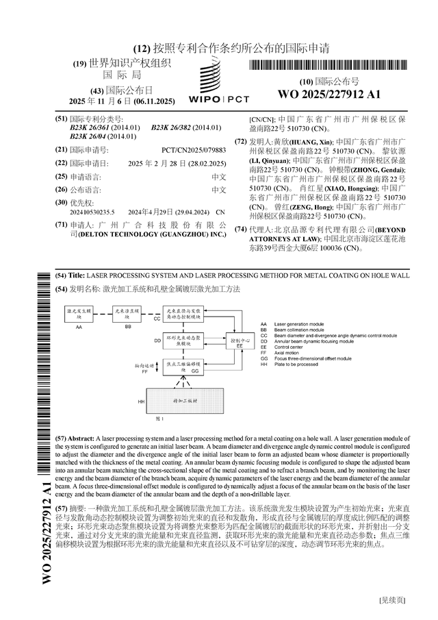 证券之星消息,根据企查查数据显示广合科技(001389)公布了一项国际专利申请,专利名为“激光加工系统和孔壁金属镀层激光加工方法”,专利申请号为PCT/CN2025/079883,国际公布日为2025年11月6日。