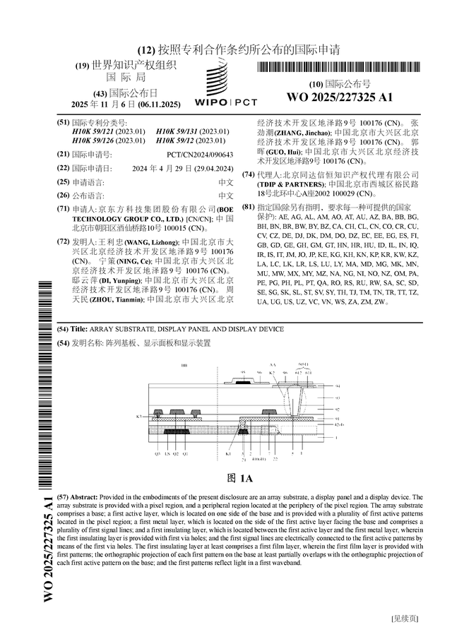 证券之星消息,根据企查查数据显示京东方A(000725)公布了一项国际专利申请,专利名为“阵列基板、显示面板和显示装置”,专利申请号为PCT/CN2024/090643,国际公布日为2025年11月6日。