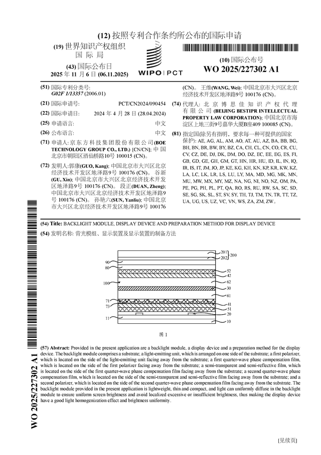 证券之星消息,根据企查查数据显示京东方A(000725)公布了一项国际专利申请,专利名为“背光模组、显示装置及显示装置的制备方法”,专利申请号为PCT/CN2024/090454,国际公布日为2025年11月6日。