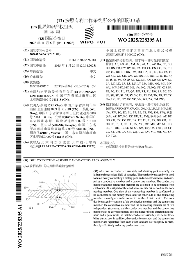 证券之星消息,根据企查查数据显示比亚迪(002594)公布了一项国际专利申请,专利名为“导电组件和电池包组件”,专利申请号为PCT/CN2025/092181,国际公布日为2025年11月6日。