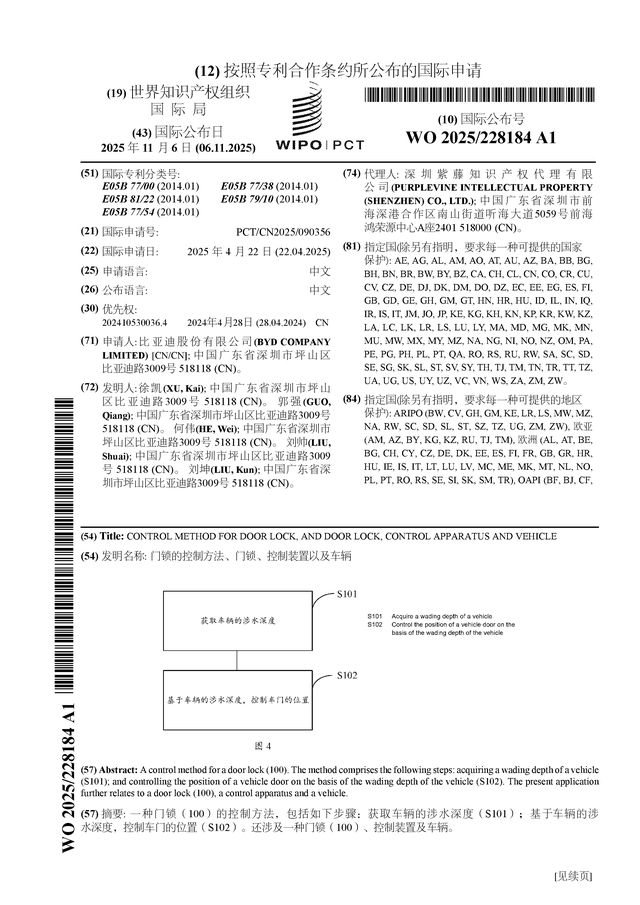 证券之星消息,根据企查查数据显示比亚迪(002594)公布了一项国际专利申请,专利名为“门锁的控制方法、门锁、控制装置以及车辆”,专利申请号为PCT/CN2025/090356,国际公布日为2025年11月6日。