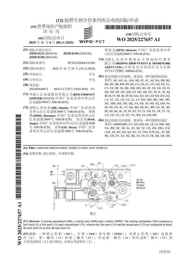 证券之星消息,根据企查查数据显示比亚迪(002594)公布了一项国际专利申请,专利名为“锁止机构、车锁和车辆”,专利申请号为PCT/CN2024/132365,国际公布日为2025年11月6日。