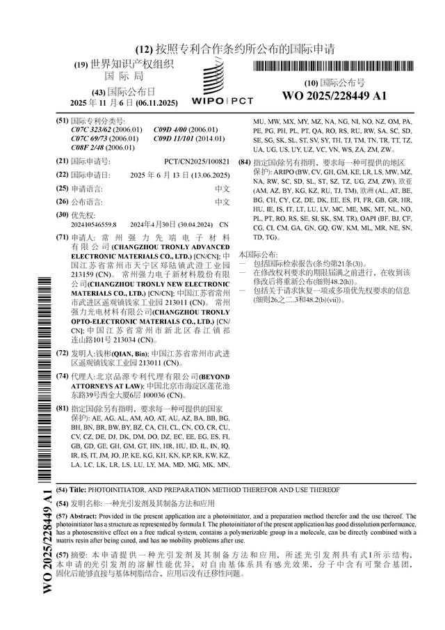 证券之星消息,根据企查查数据显示强力新材(300429)公布了一项国际专利申请,专利名为“一种光引发剂及其制备方法和应用”,专利申请号为PCT/CN2025/100821,国际公布日为2025年11月6日。