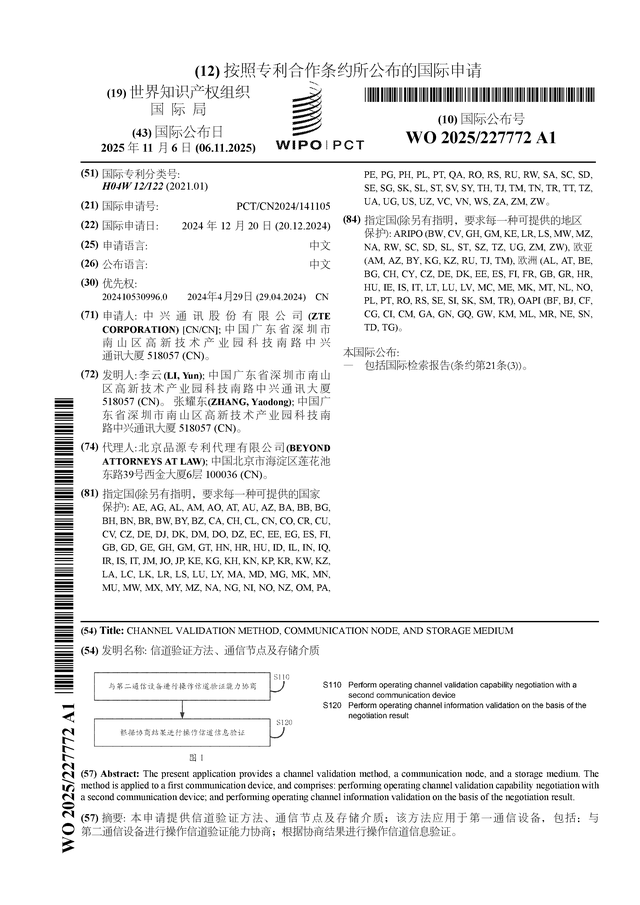 证券之星消息,根据企查查数据显示中兴通讯(000063)公布了一项国际专利申请,专利名为“信道验证方法、通信节点及存储介质”,专利申请号为PCT/CN2024/141105,国际公布日为2025年11月6日。