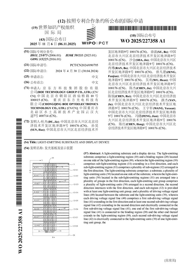 证券之星消息,根据企查查数据显示京东方A(000725)公布了一项国际专利申请,专利名为“发光基板及显示装置”,专利申请号为PCT/CN2024/090795,国际公布日为2025年11月6日。