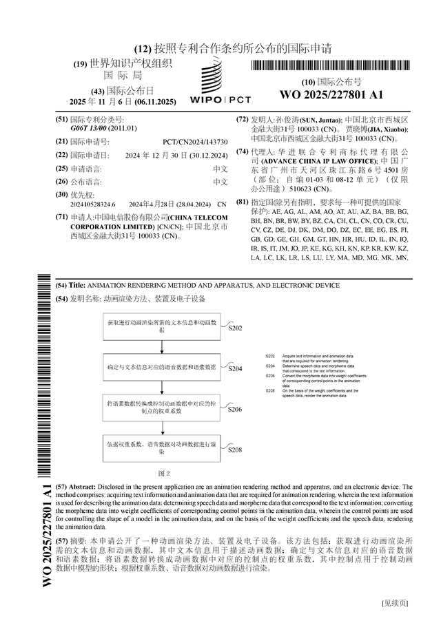 证券之星消息,根据企查查数据显示中国电信(601728)公布了一项国际专利申请,专利名为“动画渲染方法、装置及电子设备”,专利申请号为PCT/CN2024/143730,国际公布日为2025年11月6日。