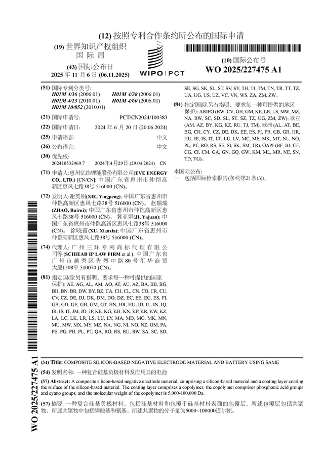 证券之星消息,根据企查查数据显示亿纬锂能(300014)公布了一项国际专利申请,专利名为“一种复合硅基负极材料及应用其的电池”,专利申请号为PCT/CN2024/100383,国际公布日为2025年11月6日。