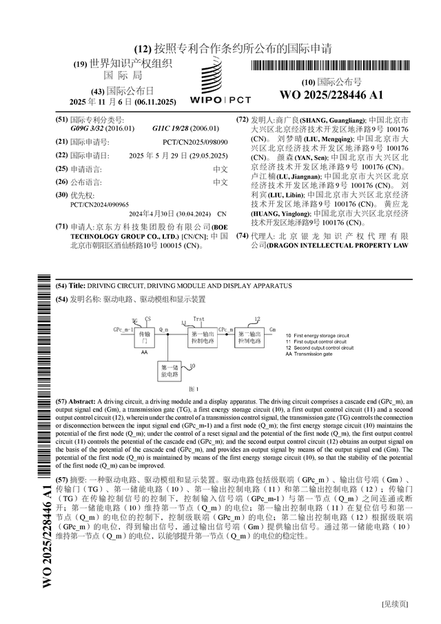 证券之星消息,根据企查查数据显示京东方A(000725)公布了一项国际专利申请,专利名为“驱动电路、驱动模组和显示装置”,专利申请号为PCT/CN2025/098090,国际公布日为2025年11月6日。
