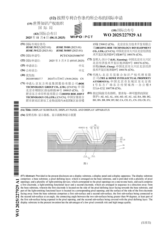 证券之星消息,根据企查查数据显示京东方A(000725)公布了一项国际专利申请,专利名为“显示基板、显示面板和显示装置”,专利申请号为PCT/CN2025/080797,国际公布日为2025年11月6日。