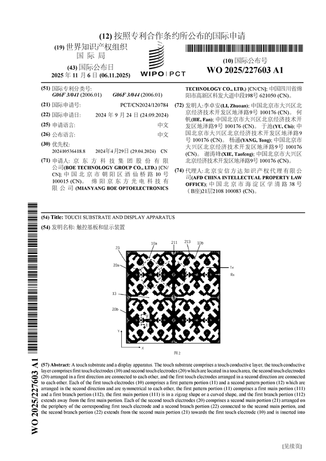 证券之星消息,根据企查查数据显示京东方A(000725)公布了一项国际专利申请,专利名为“触控基板和显示装置”,专利申请号为PCT/CN2024/120784,国际公布日为2025年11月6日。