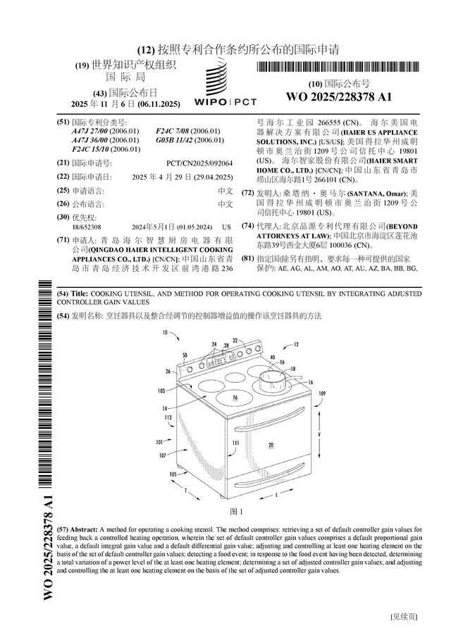 证券之星消息,根据企查查数据显示XD海尔智(600690)公布了一项国际专利申请,专利名为“烹饪器具以及整合经调节的控制器增益值的操作该烹饪器具的方法”,专利申请号为PCT/CN2025/092064,国际公布日为2025年11月6日。