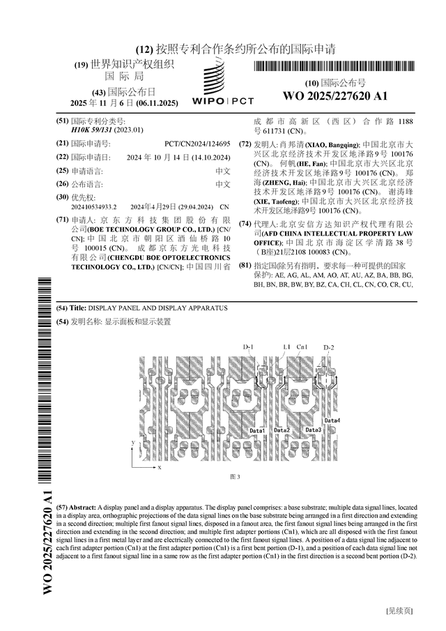 证券之星消息,根据企查查数据显示京东方A(000725)公布了一项国际专利申请,专利名为“显示面板和显示装置”,专利申请号为PCT/CN2024/124695,国际公布日为2025年11月6日。