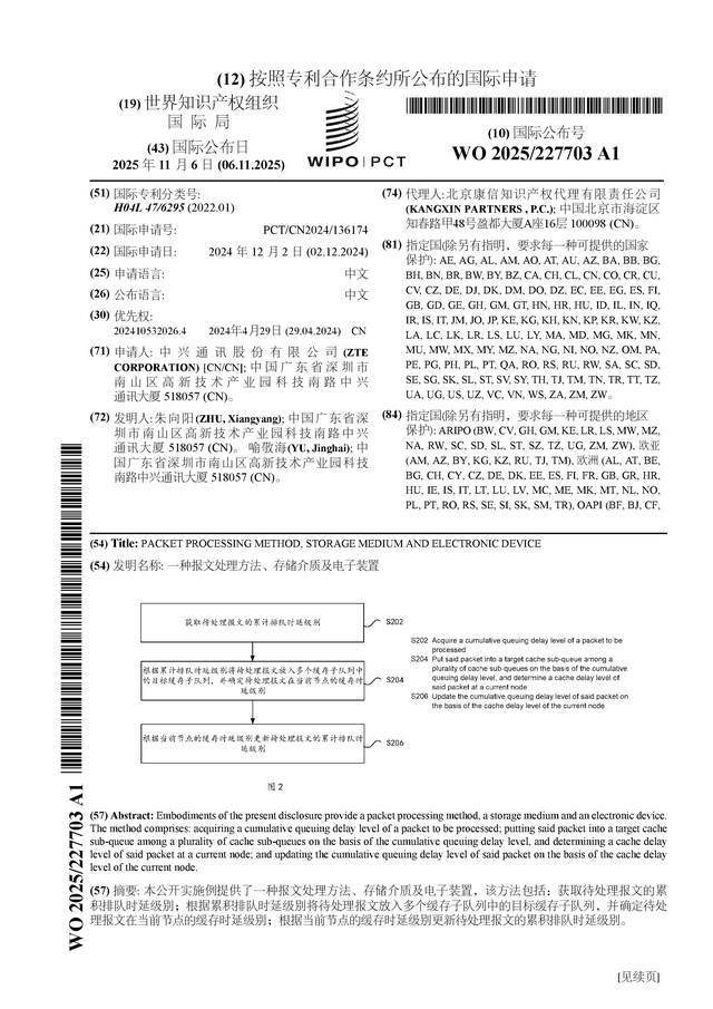 证券之星消息,根据企查查数据显示中兴通讯(000063)公布了一项国际专利申请,专利名为“一种报文处理方法、存储介质及电子装置”,专利申请号为PCT/CN2024/136174,国际公布日为2025年11月6日。