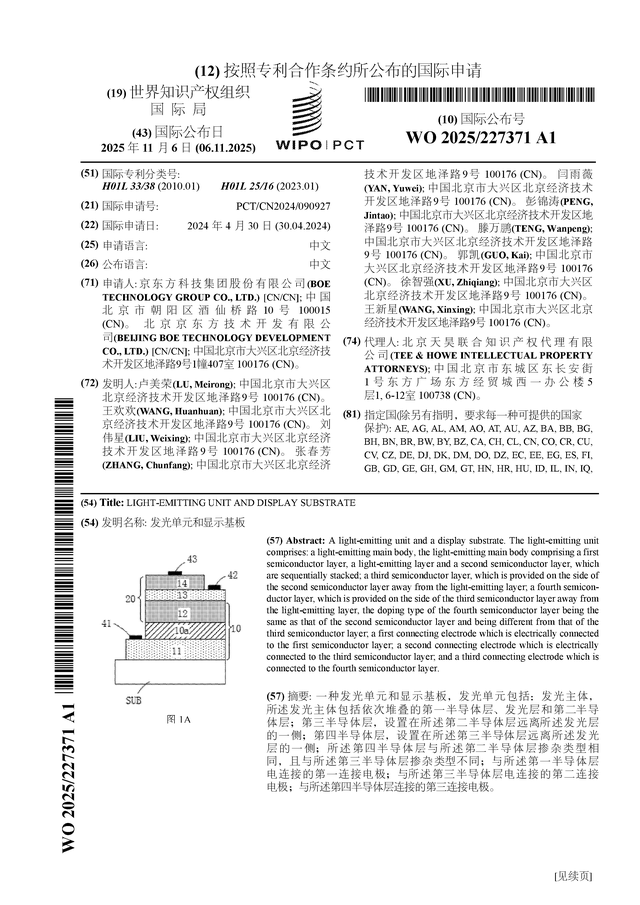 证券之星消息,根据企查查数据显示京东方A(000725)公布了一项国际专利申请,专利名为“发光单元和显示基板”,专利申请号为PCT/CN2024/090927,国际公布日为2025年11月6日。