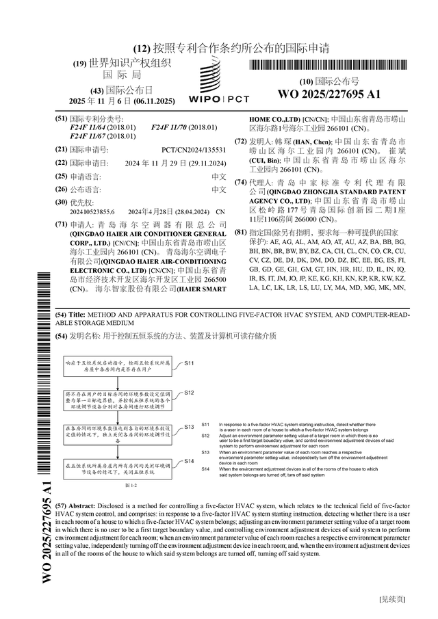 证券之星消息,根据企查查数据显示XD海尔智(600690)公布了一项国际专利申请,专利名为“用于控制五恒系统的方法、装置及计算机可读存储介质”,专利申请号为PCT/CN2024/135531,国际公布日为2025年11月6日。