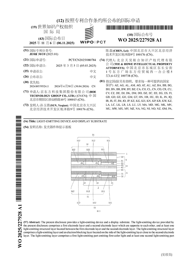 证券之星消息,根据企查查数据显示京东方A(000725)公布了一项国际专利申请,专利名为“发光器件和显示基板”,专利申请号为PCT/CN2025/080784,国际公布日为2025年11月6日。