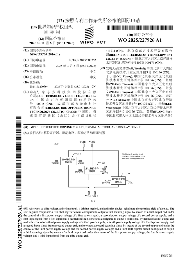 证券之星消息,根据企查查数据显示京东方A(000725)公布了一项国际专利申请,专利名为“移位寄存器、驱动电路、驱动方法和显示装置”,专利申请号为PCT/CN2025/080752,国际公布日为2025年11月6日。